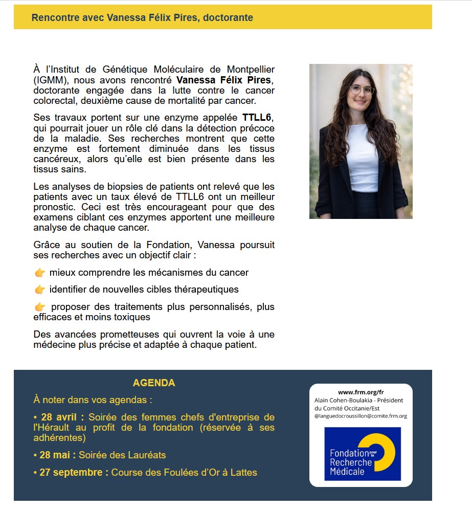 Vanessa Félix Pires, doctorante au sein de l’équipe de Michael Hahne à l’IGMM, soutenue par la Fondation pour la Recherche Médicale (FRM), partage ses travaux sur l’enzyme TTLL6, prometteuse pour mieux comprendre et détecter le cancer colorectal.